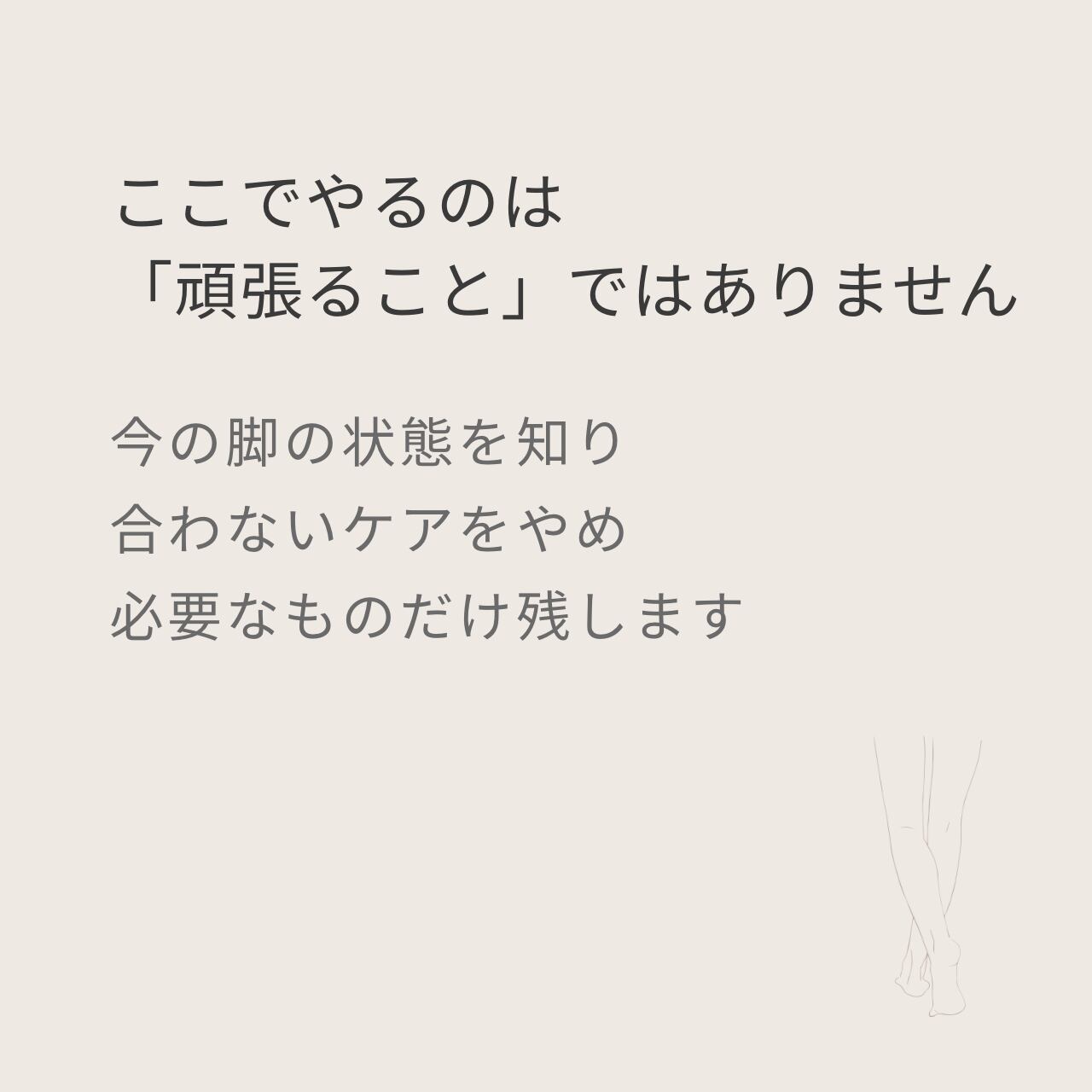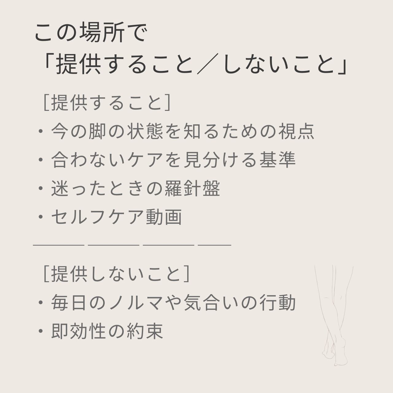(例:「実は、かえって脚を痛めてしまう」ケア/マッサージ不要な場所の確認/現時点で重点的にケアする必要のない場所の確認)